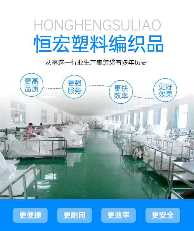 河北恒宏塑料编织品有限公司位于大唐名相魏征故里--河北省邯郸市馆陶县,本公司有缝纫工150人,日产5000条,可接急单,全年可接单,为许多大中小型企业服务,小企业中有个体户,主营产品为各种规格集装袋,吨袋等系列包装产品。恒宏包装对集装袋有丰富的生产经验,从事这一行业生产集装袋有多年历史。产品远销韩国、日本、美国、智利、澳大利亚、东南亚、蒙古国等多国家。国内市场为河北、山西、山东、河南、广东、广西、东北三省、贵州、福建、四川、银川、蒙古等覆盖全国各省。
